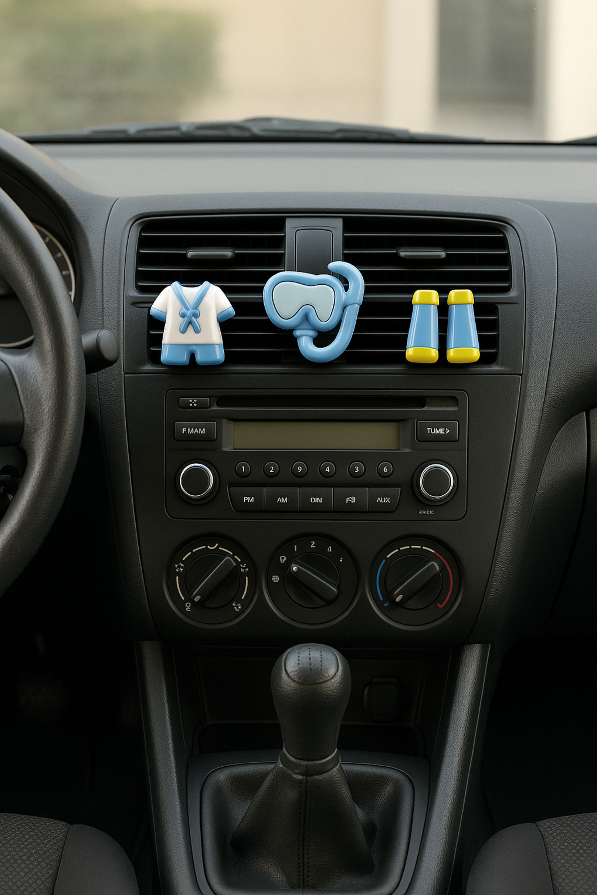 Aracınızın içini eğlenceli ve sevimli detaylarla süslemek isteyenler için tasarlandı!Bu mini araba klima süsü seti, 3 parçadan oluşur: dalış maskesi, denizci kıyafeti ve dürbün figürü.; Her bir parça kolayca araç klima ızgarasına takılabilir, yerinden oynamaz ve sürüş sırasında düşmez.; Kullanım Alanı: Araç içi klima ızgarasıTasarım: Sevimli ve renkli dalış temasıMontaj: Klipsli tasarım sayesinde kolayca takılır ve çıkarılırMalzeme: Dayanıklı plastik📏 Ürün ÖlçüleriHer bir figür yaklaşık:Genişlik: 1,5 – 2 cmYükseklik: 1,5 – 2 cmDerinlik: 1 – 1,5 cm
