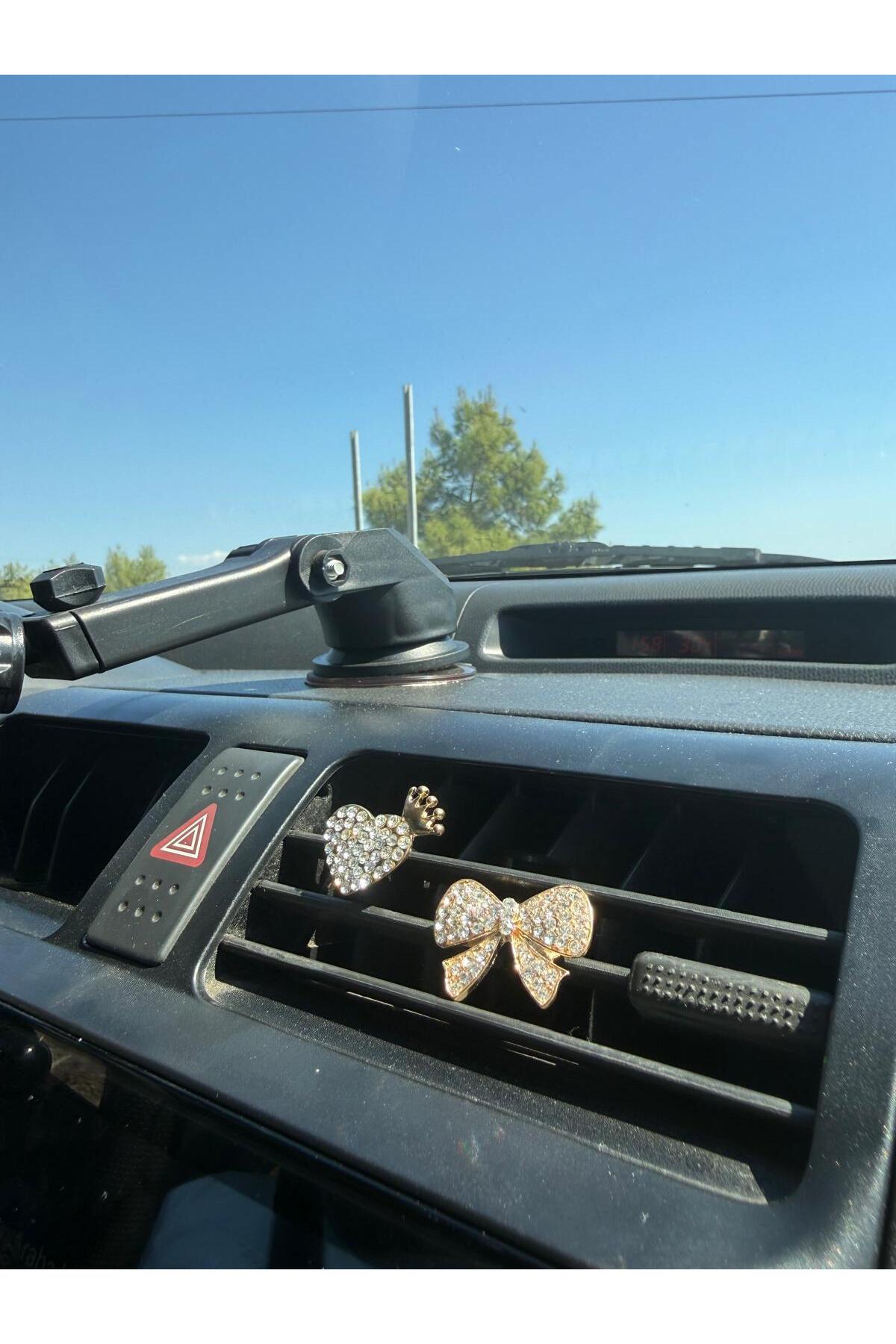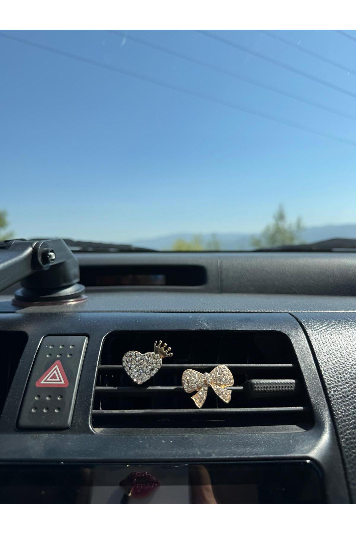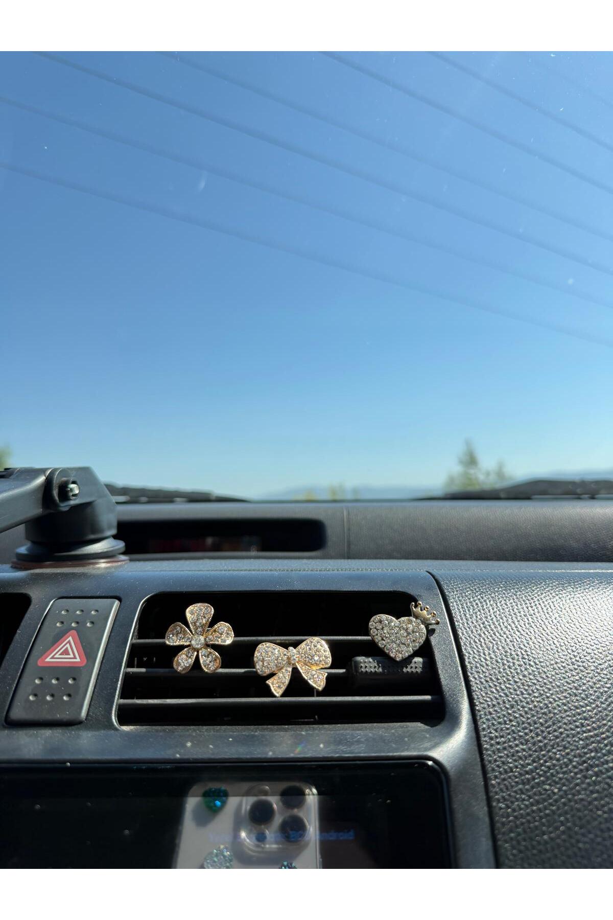 Gold Çiçek Fiyonk ve Kalp Taşlı Klima Izgara Süsü – 3’lü Araç İçi Dekoratif Aksesuar