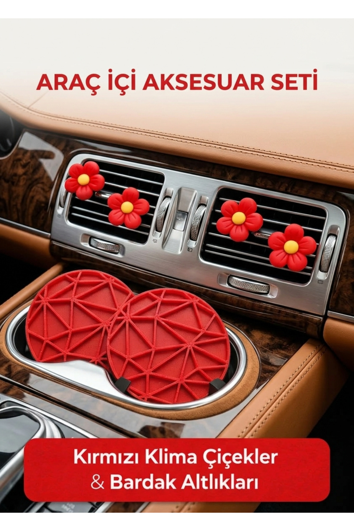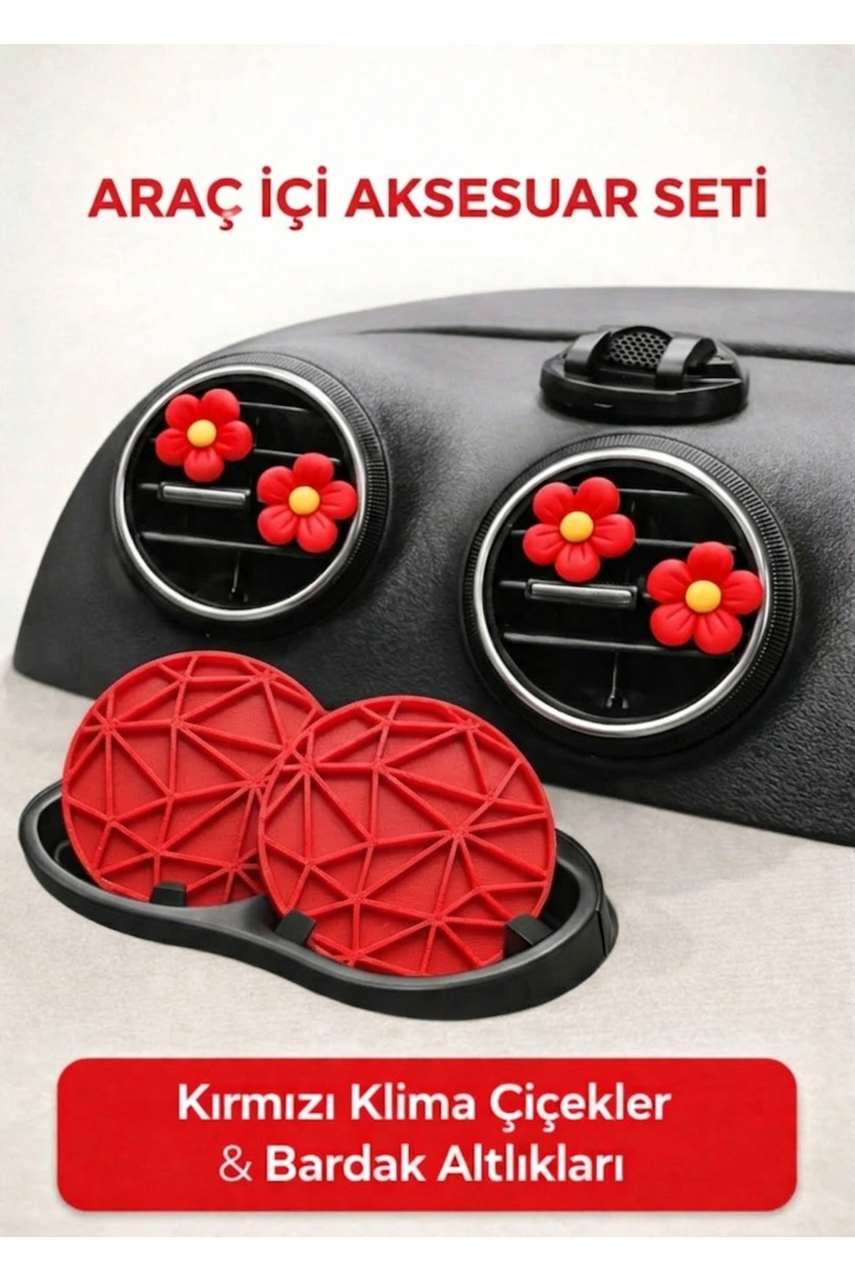 Kırmızı Araç İçi Aksesuar Seti – Klima Süs Çiçek & Bardak Altlığı 6’lı Set