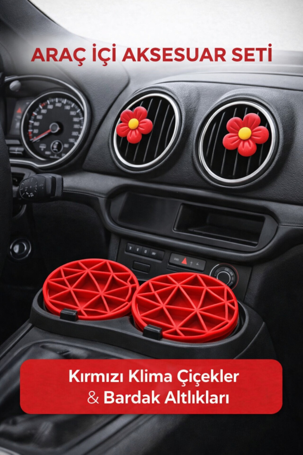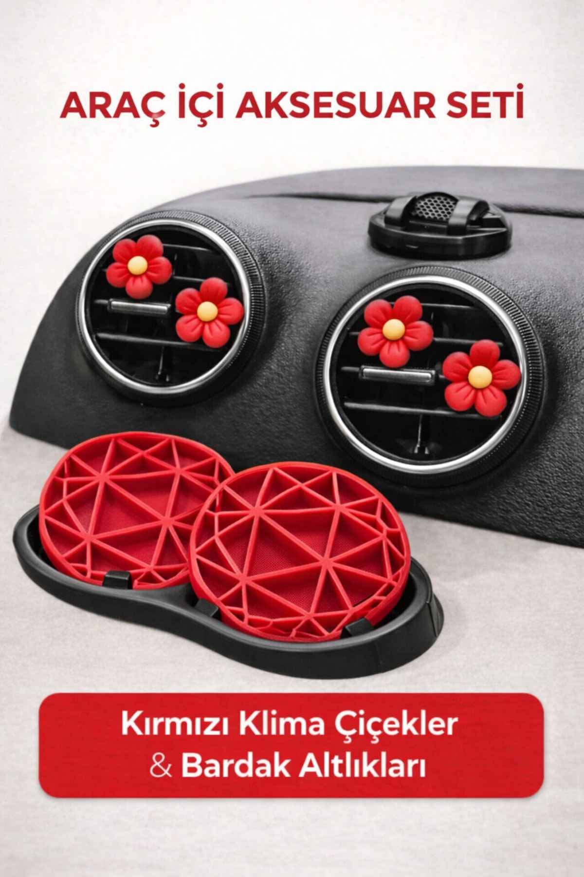 Aracınızın içini zarif ve tatlı bir dokunuşla yenileyin! Kırmızı tonlarıyla tasarlanan bu özel araç içi aksesuar seti, hem estetik hem de kullanım kolaylığı sunar.; Uyumlu tasarımı sayesinde aracınızın iç dekorasyonuna modern ve sevimli bir hava katar.; Set İçeriği: 🌸 4 Adet Pastel Kırmızı Klima Süs Çiçek ☕ 2 Adet Pastel Kırmızı Bardak Altlığı Klima ızgaralarına kolayca takılabilen çiçek süsler, aracınızın içini anında canlandırır.; Geometrik desenli bardak altlıkları ise bardaklık bölümünü çizilmelere ve dökülmelere karşı korurken şık görünüm sağlar.; Öne Çıkan Özellikler: Kırmızı uyumlu set tasarımı Araç içi dekorasyon için ideal Bardaklıklar için kaymaz ve koruyucu yapı Kolay takılıp çıkarılabilir klima süsleri Günlük kullanım ve hediye için uygundur 🎁 Kendiniz için ya da sevdiklerinize tatlı bir hediye alternatifi olarak tercih edebilirsiniz.;